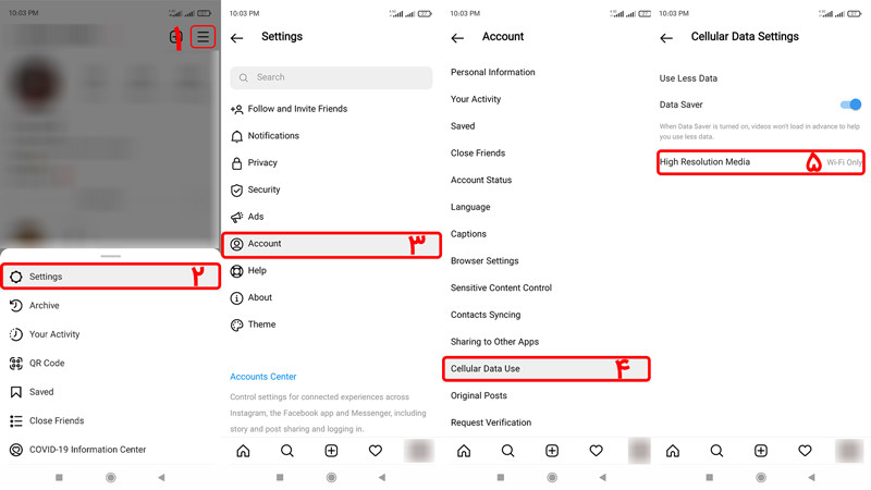 در همان بخش Cellular Data Use یا مصرف داده شبکه همراه که در روش قبلی دیدیم، گزینه دیگری هم با عنوان high-resolution media (رسانه با وضوح بالا) وجود دارد. این گزینه تضمین ارائه محتواهای تصویری با بیشترین کیفیت را میدهد؛ اما بدون شک این موضوع باعث افزایش مصرف داده یا اینترنت شما هم میشود. پس برای کاهش مصرف اینترنت اینستاگرام بهتر است تا این گزینه را غیرفعال کنید.